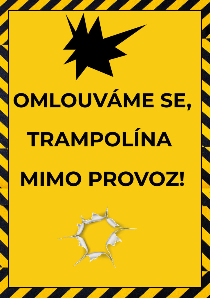 s lítostí vás informujeme, že trampolína v našem areálu je dočasně mimo provoz z důvodu poškození. V nejbližší době zajistíme opravu a uvedeme ji zpět do plného provozu.